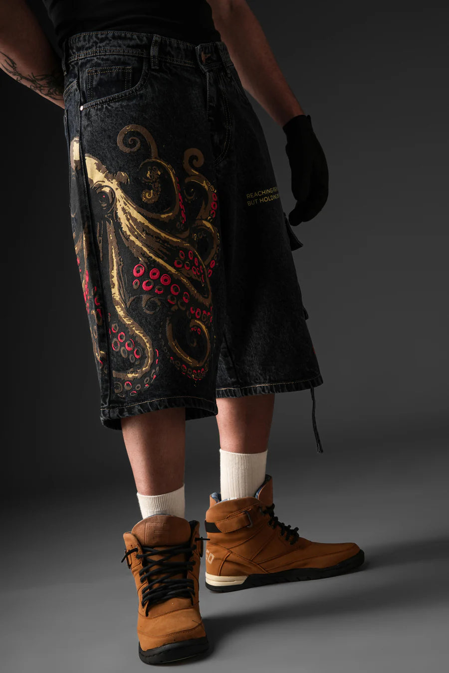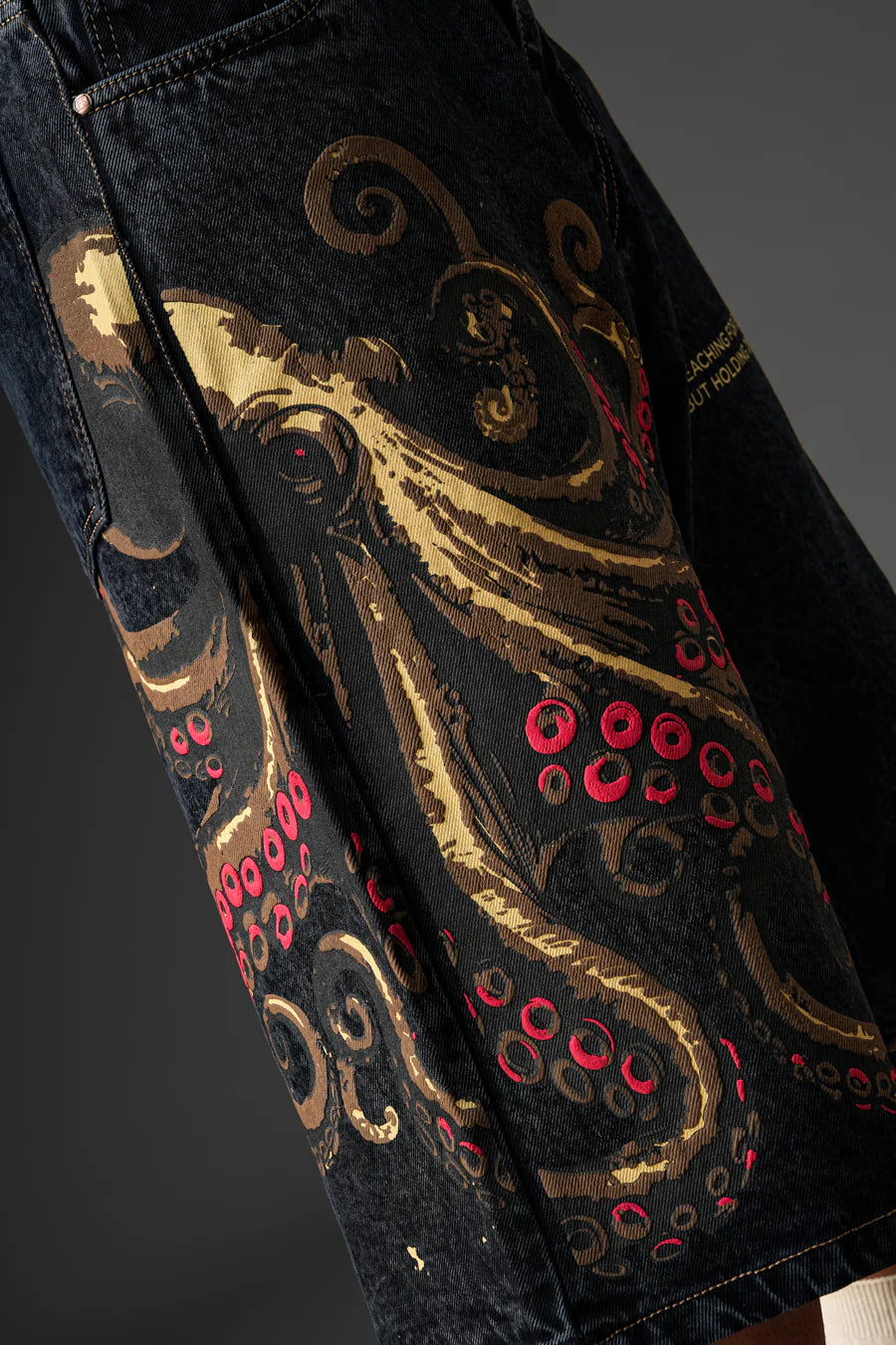 One leg features an octopus in detailed screen and puff print, its arms stretching in every direction. The other side has a pocket with writing that reads Reaching out to everything, holding onto nothing. Made from sturdy cotton denim, the design captures the feeling of searching wide yet staying unbound. Finished with precise printing and a washed texture that adds depth and character to the piece.
